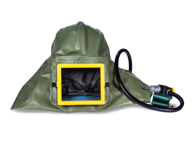 El capuchón arenero es un equipo de respiración superior, con línea de aire, bajo presión positiva, incluye válvula de flujo regulable.