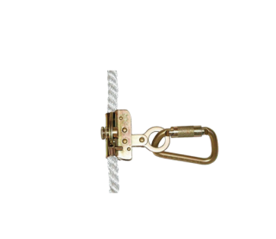 Fabricado en acero inoxidable estampado, desliza sobre la línea de anclaje, con conector de cierre automático y bloqueo manual.